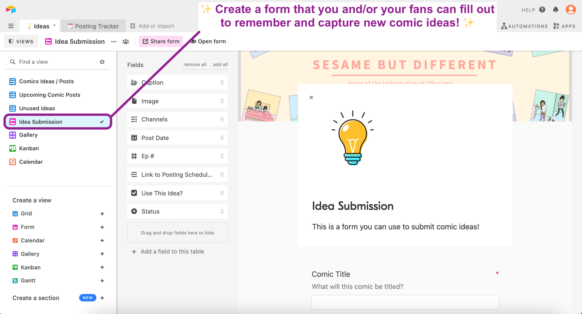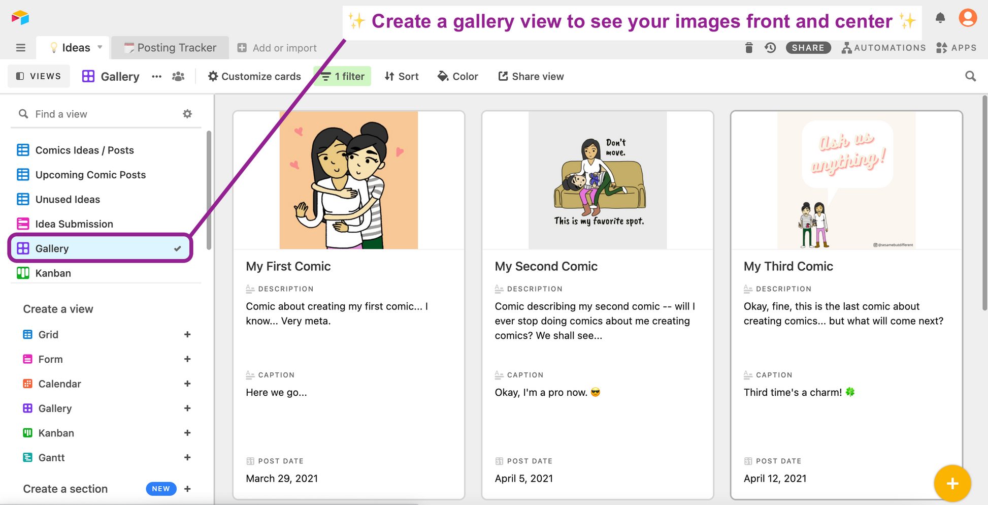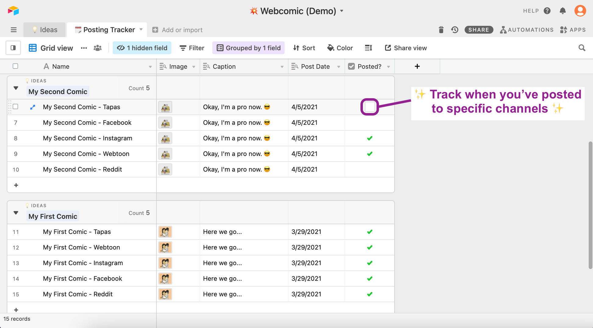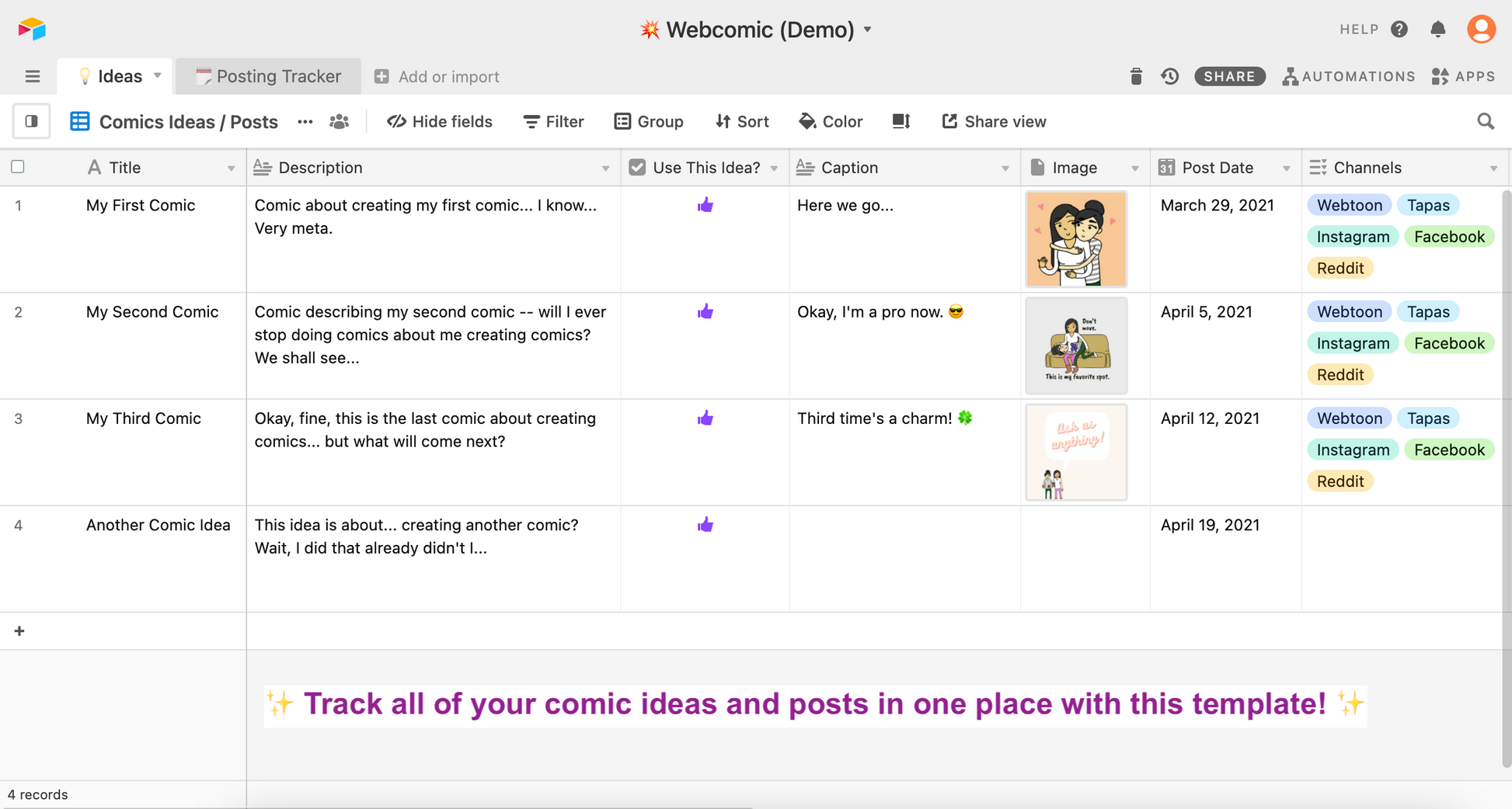 This is a template of the system in Airtable (an all-in-one smart spreadsheet / database) that I use to collect my comic ideas and also track my content posting schedule. It includes dynamic status formulas that let you know when due dates are coming up, pre-made views and rollup fields that show you if you've finished posting on all of your channels. This is a great foundation for anyone who needs to track multiple posts on social media and other platforms (e.g., blogs, videos, updates, etc.).