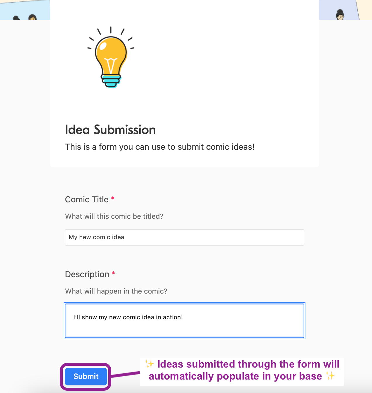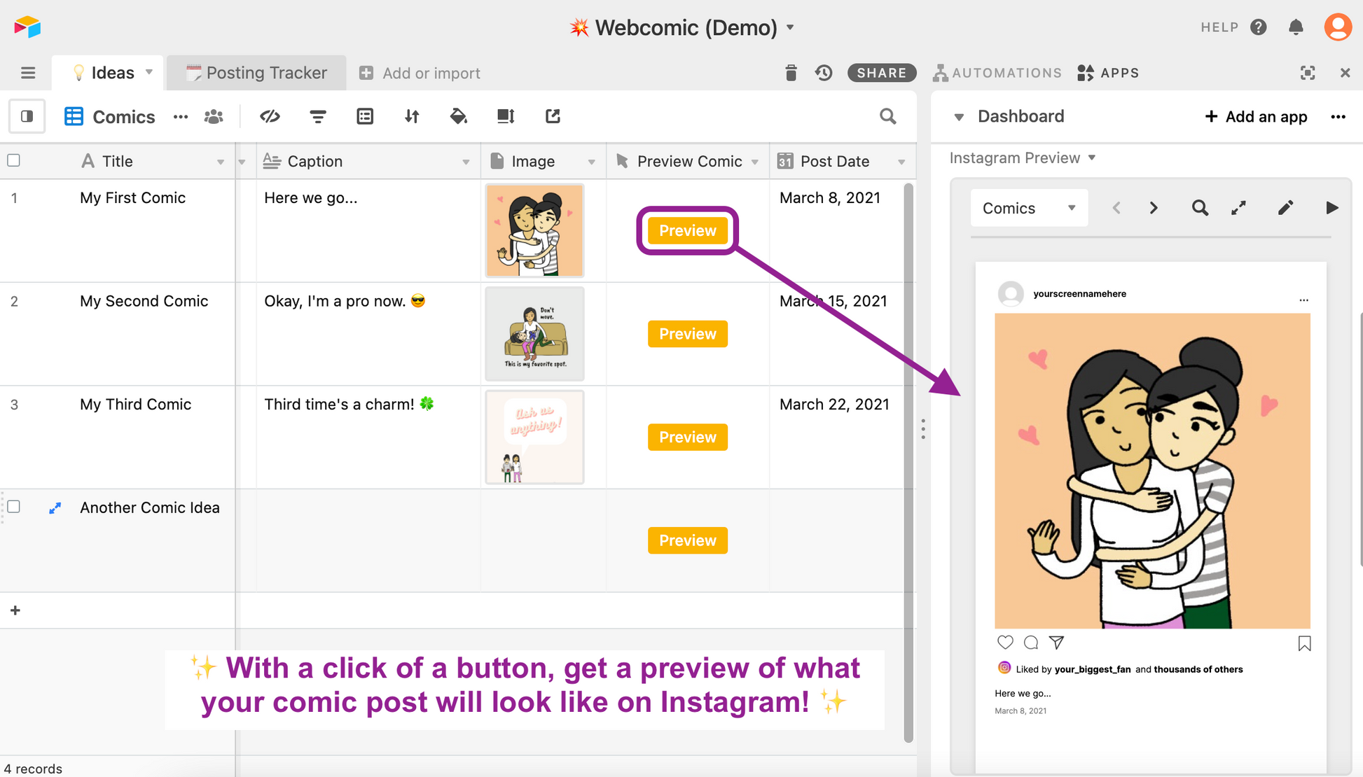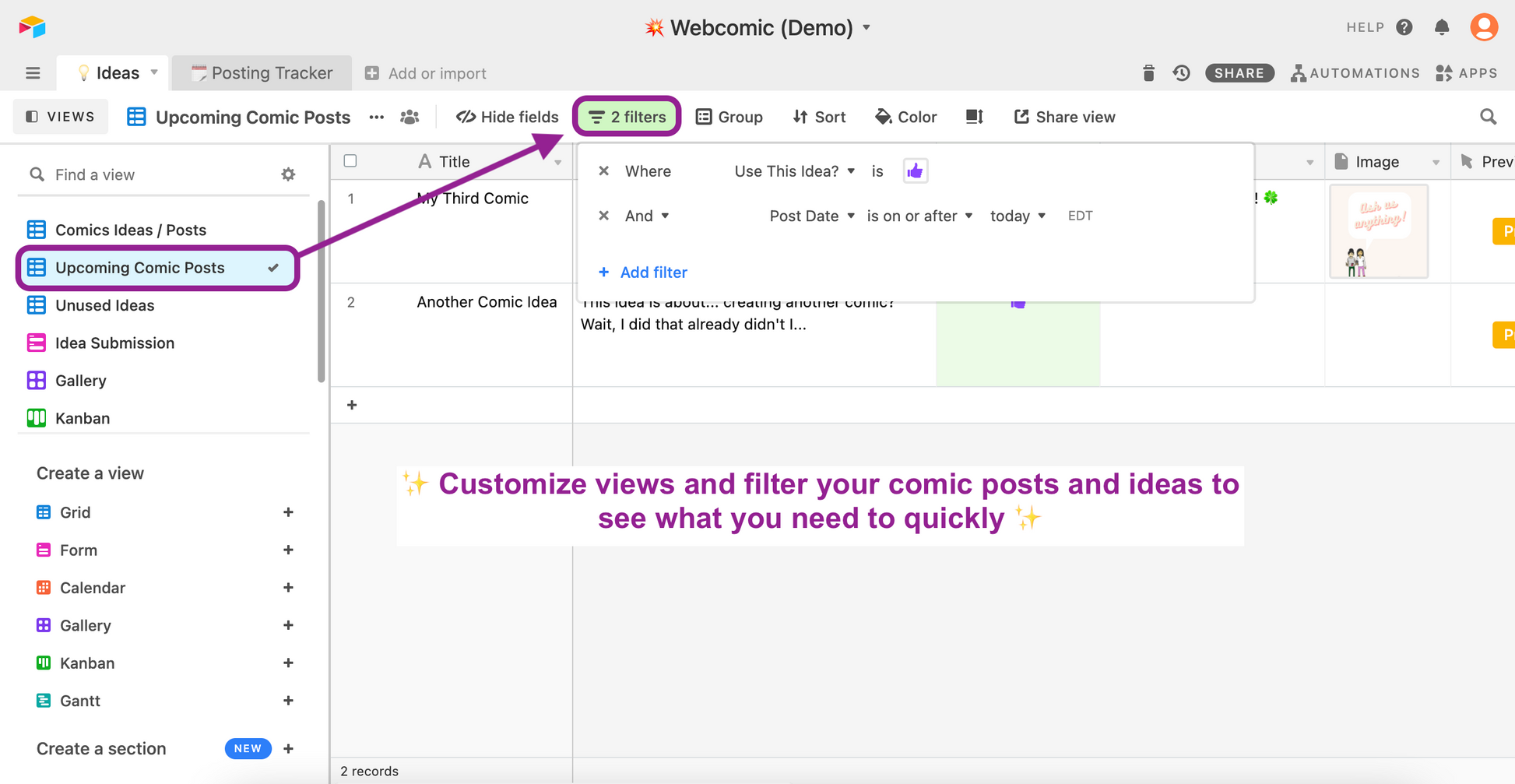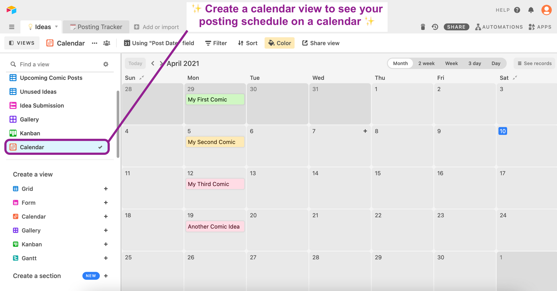 This is a template of the system in Airtable (an all-in-one smart spreadsheet / database) that I use to collect my comic ideas and also track my content posting schedule. It includes dynamic status formulas that let you know when due dates are coming up, pre-made views and rollup fields that show you if you've finished posting on all of your channels. This is a great foundation for anyone who needs to track multiple posts on social media and other platforms (e.g., blogs, videos, updates, etc.).