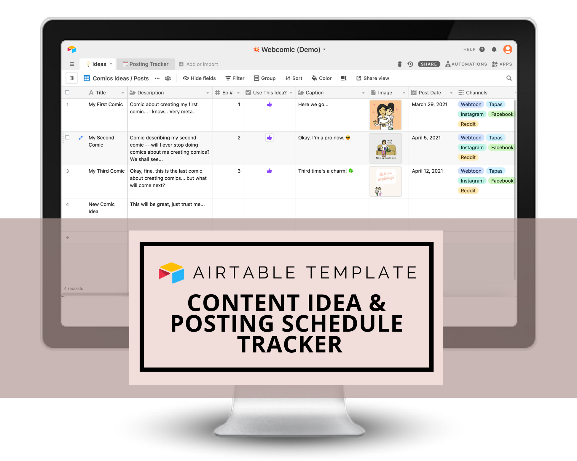 As a comic artist who posts on 6+ channels (Webtoon, Tapas, Instagram, Facebook, Tumblr, etc.) every week, I created this template to keep all of my content ideas in one place and to ensure that I never miss or delay posting on any of my social media platforms.