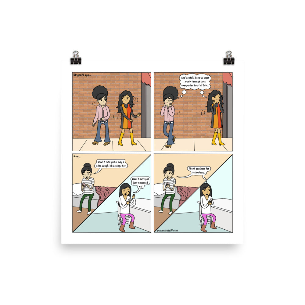 A cute lesbian relationship comic print about what it was like trying to find a girlfriend 50 years ago vs today with dating apps. Makes for a great lesbian anniversary, birthday, or holiday gift for your girlfriend or partner.