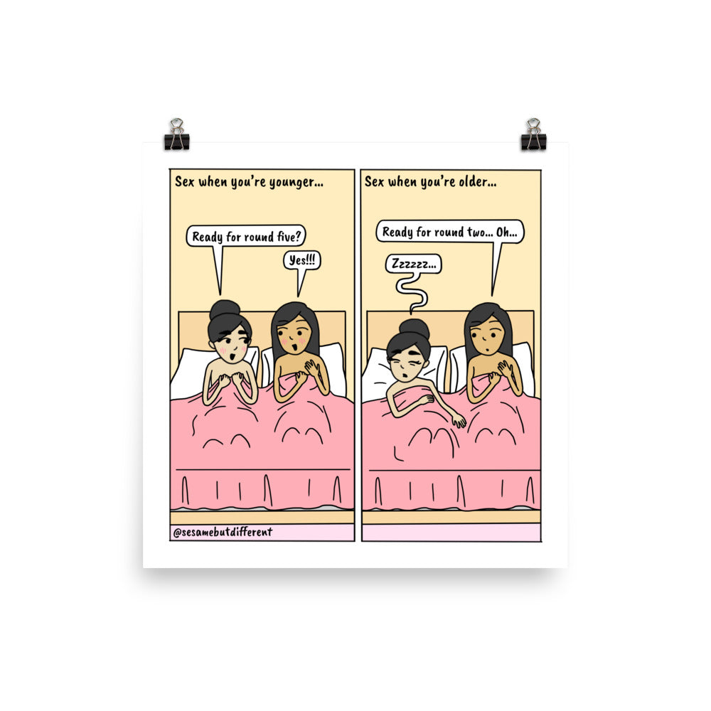 A cute lesbian relationship comic print about having sex with your partner back then versus now. Makes for a great lesbian anniversary, birthday, or holiday gift for your girlfriend or partner.